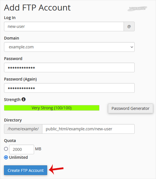 • Directory: For granting access to the entire directory of /public_html, enter public_html or change the directory path to a sub-directory such as public_html/new-user. An FTP user doesn't have access outside the specified directory.